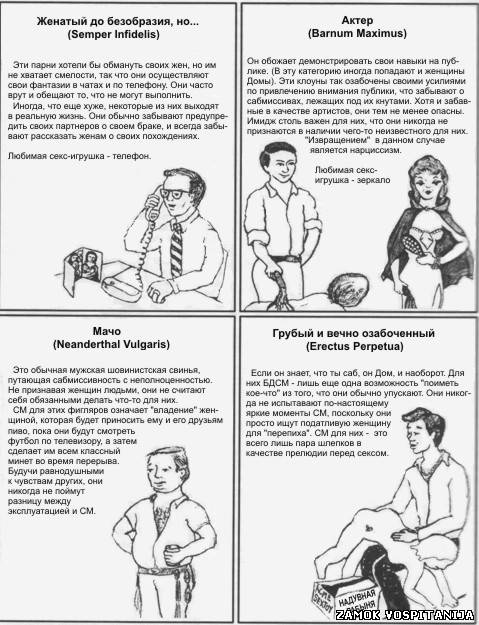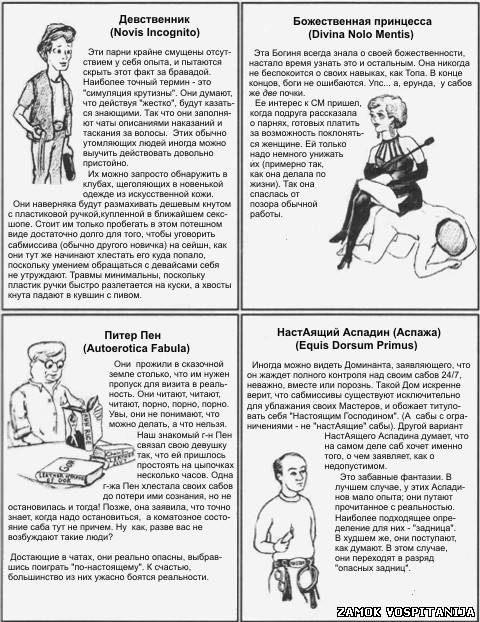 Девственник ( Novis Incognito) – Эти парни крайне смущены отсутствием у себя опыта, и пытаются скрыть этот факт бравадой. Наиболее точный термин – это «симуляция крутизны». Они думают, что действуя «жестко», будут казаться знающими. Так что они заполняют чаты описаниями наказаний и таскания за волосы. Этих обычно утомляющих людей иногда можно выучить действовать довольно пристойно.