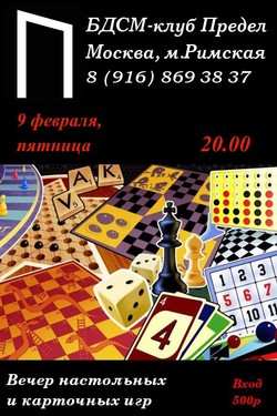 Приглашаем всех желающих в Предел в воскресенье 9 февраля на очередной Вечер настольных и карточных игр. Мероприятие планируется ванильное, поэтому если у вас есть друзья, спокойно относящиеся к атмосфере БДСМ-клуба и любящие настолки / карты - то приглашайте их тоже, почему нет? Что будет? 1) В клубе есть множество настольные игры: Активити, Имаджинариум, Диксит, Табу, Элиас, Уно, Spy Fall - Находка для шпиона, Знаменитость, Таймлайн, Экспромт, Каркассон, Повелитель Токио, Табу, Твистер, 50 Оттенков Серого, Монополия, Дженна, Шакал, Фонарики и наверняка ещё что-то. Если хотите что-то своё - приносите, будем только рады. 2) Специально для Предела мы создали особый, БДСМный комплект карточек для игры "Табу". Все понятия на карточках касаются исключительно БДСМ. Думаю, будет весело поиграть в это. 3) Для любителей карточных игр будут организованы столы для преферанса и покера. Чтобы найти партнеров на игру, узнать, кто собирается прийти, задать вопросы организаторам или обсудить правила - можно подписаться на группу мероприятия: https://... Запись на вечер весьма желательна. Телефон клуба: 8 (916) 869 38 37 Клуб расположен в районе метро Римская. Стоимость - 500 рублей Начало вечера в 20.00 |
