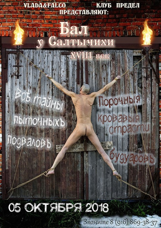 Мы рады объявить о предстоящем событии и пригласить Вас на Бал к Салтычихе. Главным событием Бала станет посещение его специально приглашенными гостями. Ревнивый и коварный Князь Голицын с супругой. Всегда непреклонен и беспощаден! Вы увидите тайные желания Пьера Безухова. Страсть, насилие и жесткость его экшена не оставят равнодушными зрителей. В этом экшене Вы сможете принять участие под руководством Салтычихи. Харизматичный красавец Маркиз Каланья Де Пуэрто выпорет батогами девиц на сеновале - будет жарко! Красавица и Укротительница диких зверей Белла Жемчужная украсит этот вечер своим участием. Её экшен совмещает в себе разнообразие практик и эстетику исполнения. Прекрасная заводчица бойцовских псов Екатерина Вяземская предложит Вашему вниманию бой собак бойцовских пород. Не рекомендуем заходить за ограждение! Загадочный Граф Калиостро своим мистическим экшеном раскроет тайну оживления статуи девушки. Также посетит нас заморский гость - Высокопоставленный посол Голландии Bob RopeMarks. Вести программу бала будет хозяйка бала Салтычиха (Дарья Салтыкова), прославившаяся своей жесткостью и страстью к садизму. Вы сможете вместе с нами не только прикоснуться к атмосфере XVIII века, но и принять активное участие: в собачьих боях (ставить ставки или выставить своего пса на бой), для вас мы подготовили комнату с карточным столом в покер, бридж и другие карточные игры, разоблачение Наташи Ростовой, разучивание вальса с Поручиком Ржевским, купить или продать крепостных и многое другое! В вашем распоряжении будет три зала - главный зал, покерная комната, сеновал. Будут работать два бара, где вы сможете насладиться вкусными коктейлями и посмотреть Бармен-шоу. Призы и подарки ожидают самых активных участников. Конкурс на лучший костюм XVIII века. Победителям вручат памятные призы. Для мужчин и женщин нижнего позиционирования предлагаем выставить свою кандидатуру на продажу - вы получите скидки на бар или билет. Дресс-код: мы приветствуем наряды XVIII-XIX века (подробную информацию о нарядах той эпохи мы выложим отдельным постом). Для Дам Верхнего позиционирования: Платья исторической эпохи XVIII-XIX века, вечерние платья в пол, наличие аксессуаров (веера, диадемы, ожерелья и так далее). Для нижних дам: сарафаны в пол XVIII века, исподняя рубаха, холщовка, частичное или полное обнажение. Для Верхних мужчин: исторические костюмы XVIII века, военные мундиры XVIII века, белая рубашка - черные брюки, наличие аксессуаров жабо, трость, часы на цепочки и так далее. Для нижних мужчин: исторические костюмы крепостных XVIII века. Холщовая рубаха, льняная рубаха, исподняя, частичное или полное обнажение. Запрет: на повседневную одежду, платья и брюки из латекса или кожи, платье длиной мини и миди. Стоимость билета - 2500 руб. по предоплате. В день мероприятия - 3000 руб. Приобрести билеты можно в клубе Предел. В цену входит фуршет и шоу-программа. Алкоголь в барах и напитки оплачиваются отдельно. Количество билетов ограничено! В 20.00 - сбор гостей. С 21.00 - начало программы. На входе мы обеспечим вас ассигнациями XVIII века - на эту валюту можно делать ставки, продавать и покупать крепостных! Правила бала: - В клубе запрещёно чрезмерное употребление алкоголя. - Фото- и видеосъёмка запрещены. - Вход со своими едой и напитками запрещён. - Во время шоу программы мы просим зрителей соблюдать ти