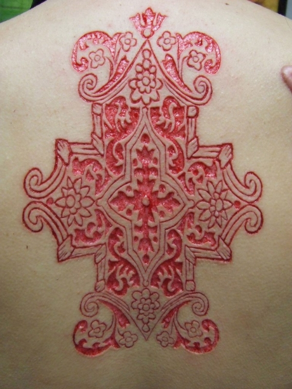 Лучше все-таки использовать скальпель. Рисунок выходит ровнее, лучше заживает. Дополнительно я бы рекомендовал близлежащие поверхности в комнате обработать антисептическим спреем, если планируется большой рисунок.